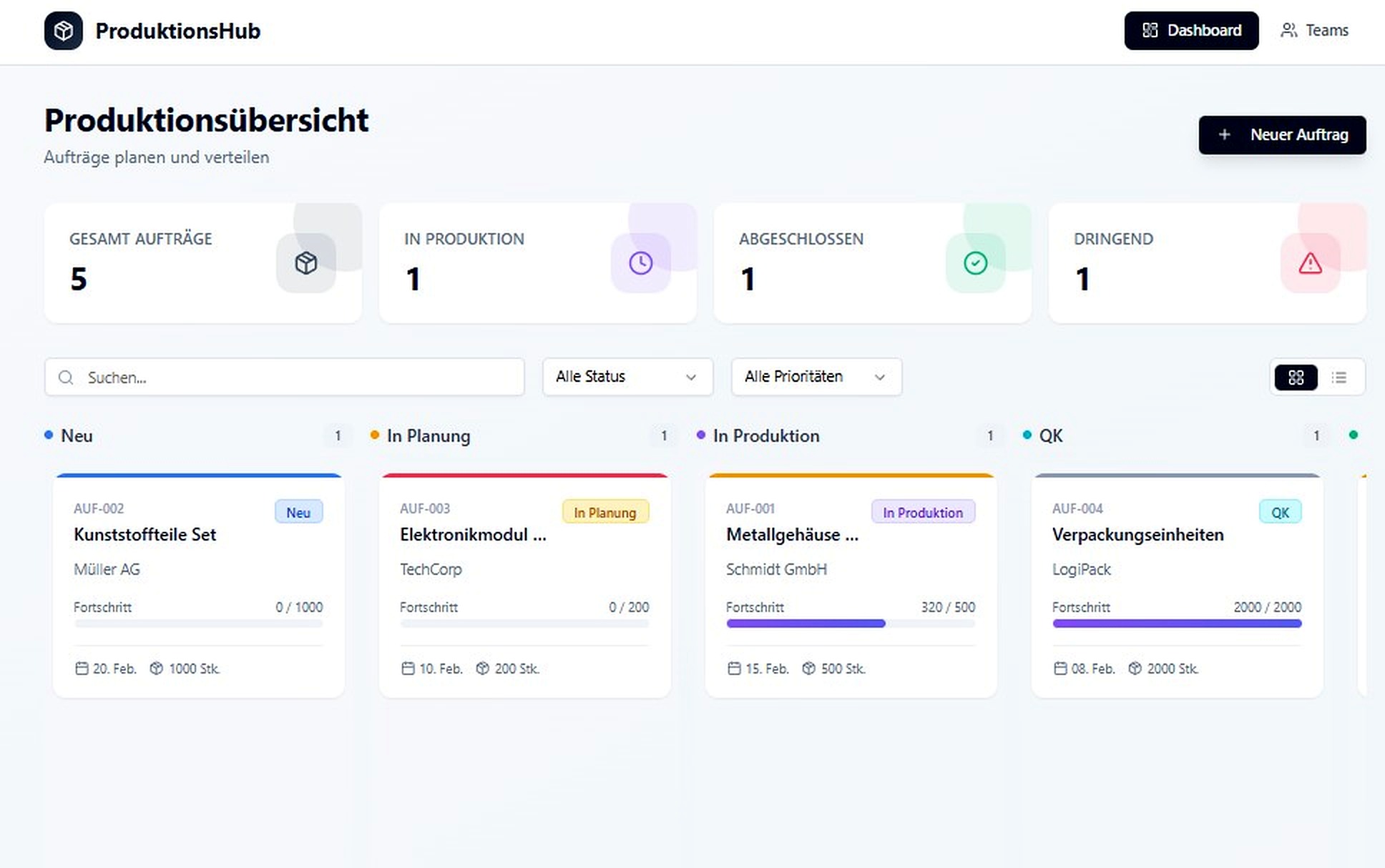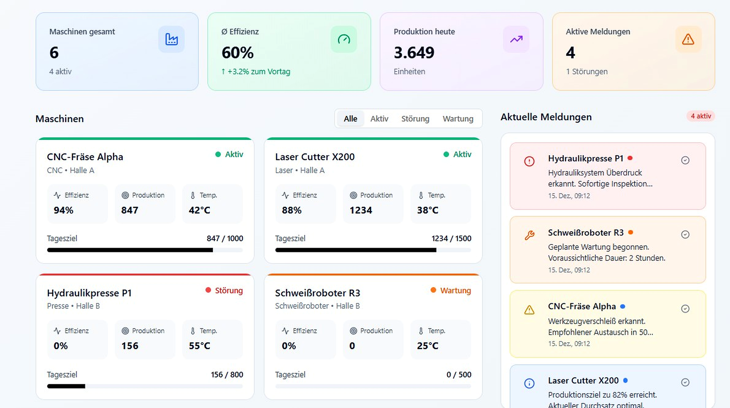 • Produktionsaufträge mit Live-Status, Fortschritt und Stillstandsursachen