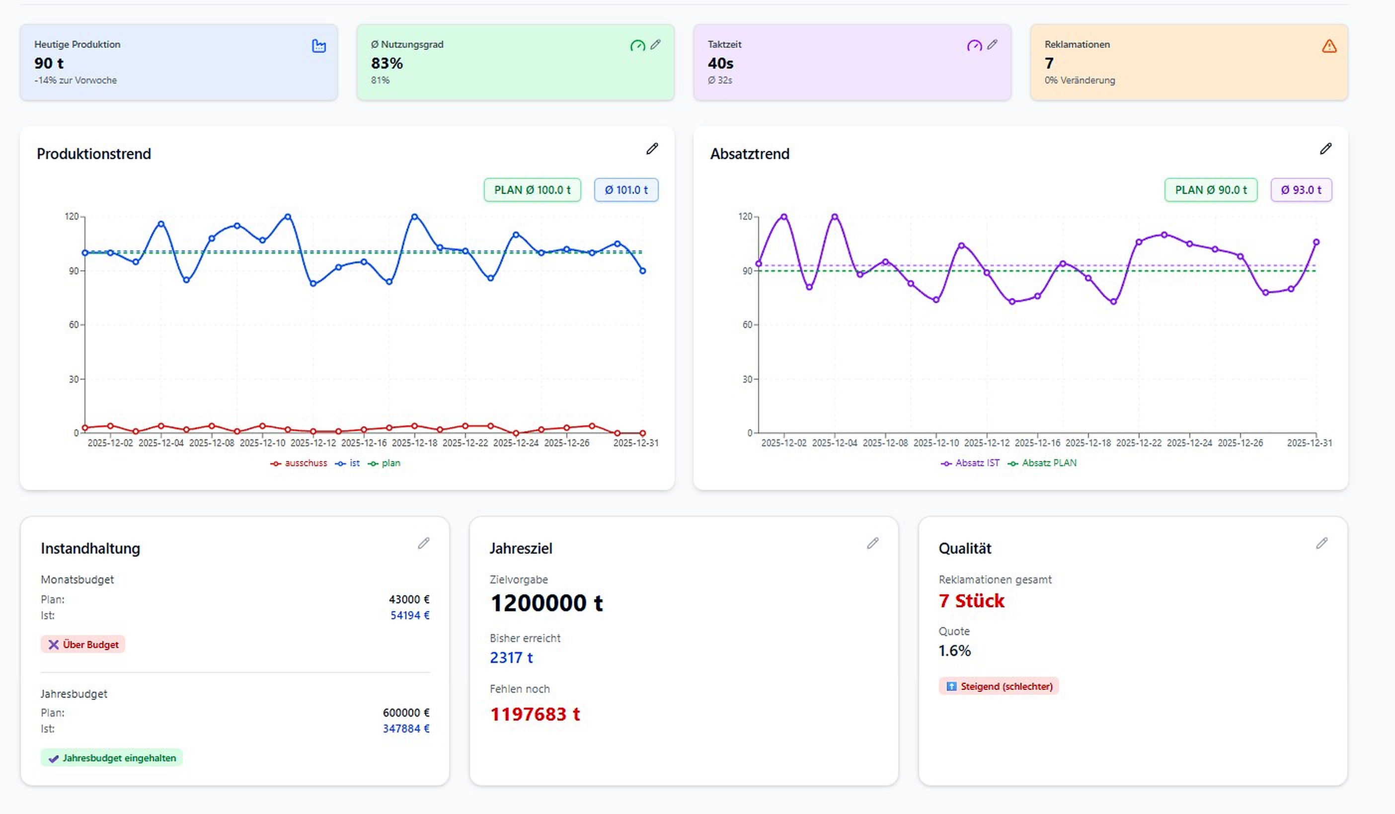 Energieverbräuche und Kosten werden nicht isoliert betrachtet, sondern im Zusammenhang mit Produktionsmenge, Anlagenzustand und Stillständen ausgewertet.
